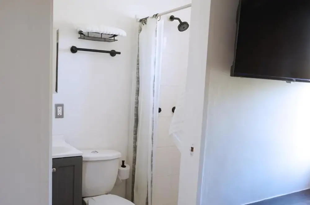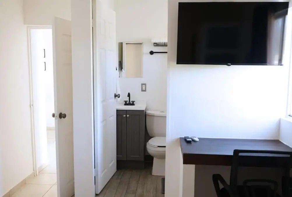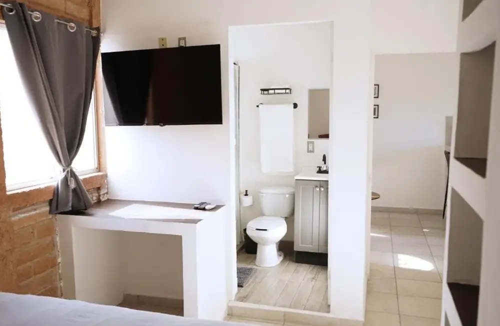 La TV nunca pude verla, muy difícil programarla, deberían ya tener una cuenta de Netflix del espacio. Un rack Para poner el jabón y artículos de limpieza en la regadera, unas servitoallas Un buró